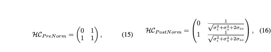 的矩阵,右下三角部分填充为 1,其余部分为占位符 0。对于 Post-Norm,权重依赖于输入和输出的方差及协方差,形成一个