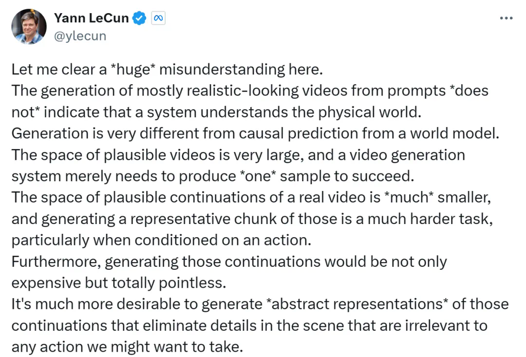 给人希望的同时,业内质疑声纷至沓来,很多人并不认为基于 DiT 架构的视频生成模型能够真正理解物理规律。其中尤以 LeCun 为代表,一直以来,这位人工智能巨头一直坚称,基于概率的大语言模型无法理解常识,其中包括现实物理规律。
