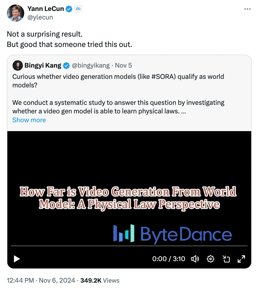相关推文在 X 发布后,获得 Yann LeCun 点赞转发,还评价道 —— 结果虽不意外,但有人尝试研究确实是一件好事。