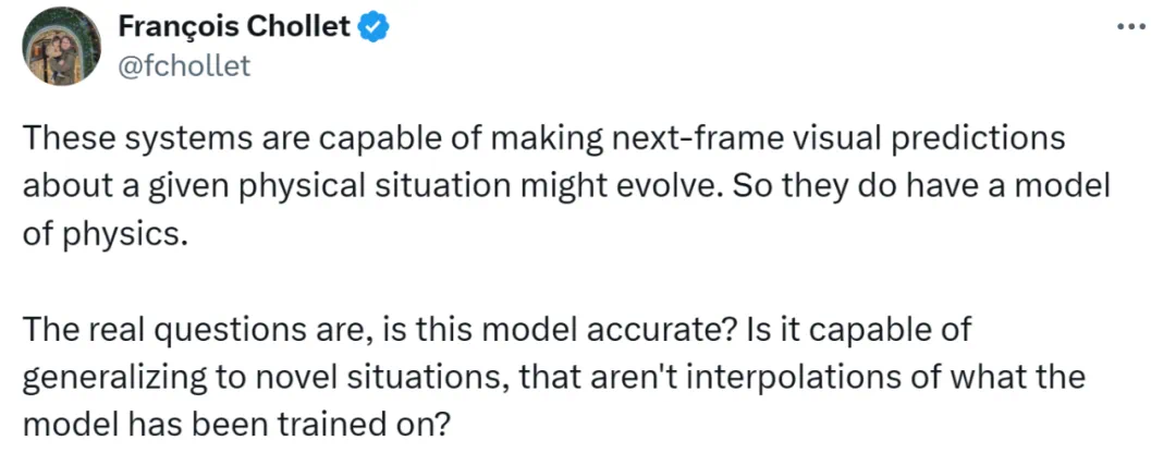 Keras 之父 François Chollet 则认为,Sora 这样的视频生成模型确实嵌入了「物理模型」,但问题是:这个物理模型是否准确?它能否泛化到新的情况,即那些不仅仅是训练数据插值的情形?这些问题至关重要,决定了生成图像的应用范围 —— 是仅限于媒体生产,还是可以用作现实世界的可靠模拟。最后他指出,不能简单地通过拟合大量数据来期望得到一个能够泛化到现实世界所有可能情况的模型。