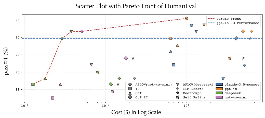 成本(Cost)指执行分割后 HumanEval 测试集的总费用。AFLOW(模型)指 AFLOW 使用该模型执行工作流,获得反馈。图例中的颜色代表在测试数据集中执行工作流所使用的不同 LLM