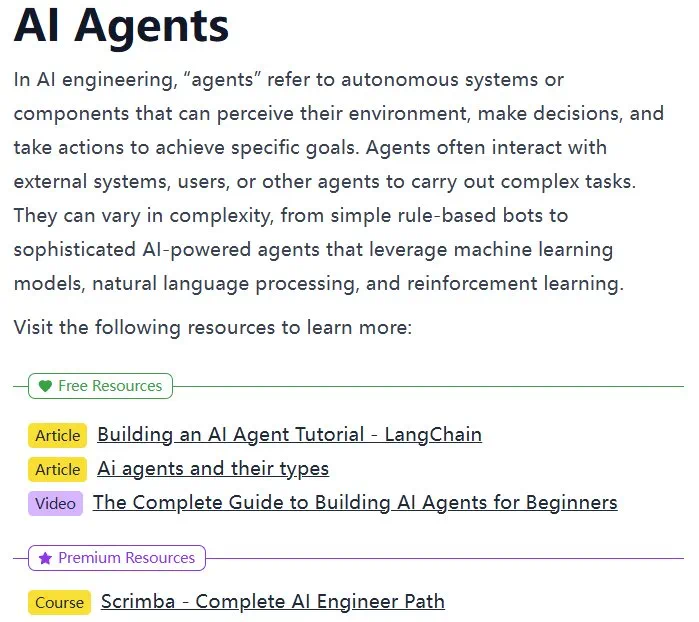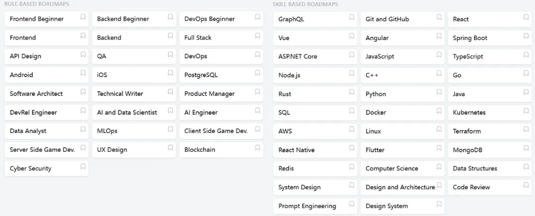 这里正好有一个你需要的资源:开发者路线图资源库(developer-roadmap)!而这个资源库中有的还不仅仅是路线图,还有那些路线图中每一步中所需的资源,包括论文/文章、视频、教程、代码、示例等等。真的是不仅要领你进门,更要把你教会。