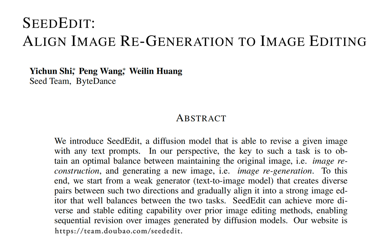 11月11日,字节在豆包大模型团队官网上公布最新通用图像编辑模型SeedEdit。SeedEdit支持一句话轻松改图,包括修图、换装、美化、转化风格、在指定区域添加删除元素等各类编辑操作,通过简单的自然语言即可驱动模型编辑任意图像。