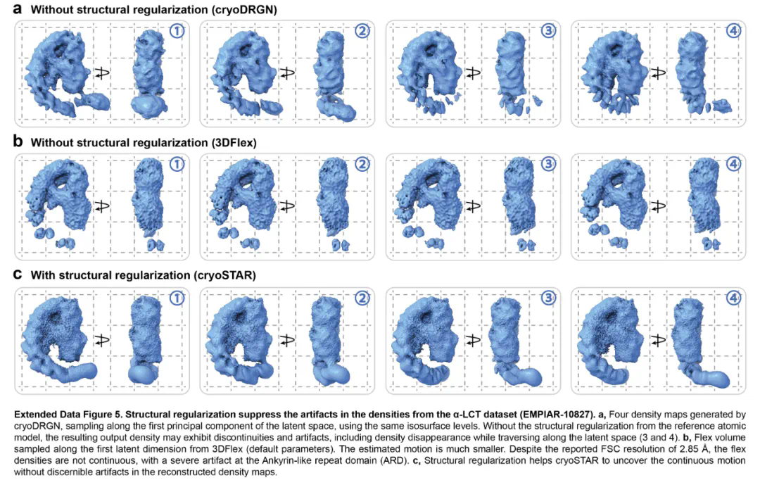 对于 毒素蛋白 α-LCT(EMPIAR-10827),cryoSTAR 揭示了两种类型的运动,与离散 3D 分类发现的两种构象相吻合,且生成的粗粒度原子模型合理,与密度图拟合良好。结构正则化在这个具有连续异质性的小蛋白中效果显著,相比其他方法如 cryoDRGN 和 3DFlex,cryoSTAR 生成的密度图更连续,能有效避免密度图中的伪影。