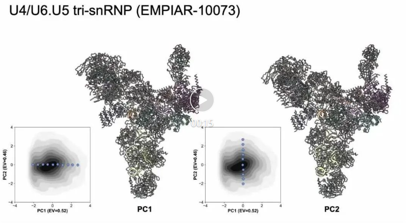CryoSTAR 在多个公开数据集(EMPIAR)的冷冻电镜实验数据上得到了验证。对于酵母预催化 B 复合物剪接体(EMPIAR-10180),使用 PDB: 5NRL 作为先验结构,cryoSTAR 成功揭示了 SF3b 和解旋酶区域的构象变化,其结果与其他方法一致,并且生成的粗粒度模型在电子密度图中得到了充分验证,展现出合理的运动模式。对于 U4/U6.U5 三核糖核蛋白(EMPIAR-10073),以 PDB: 5GAN 为参考结构,cryoSTAR 同样解析了头部结构域的动态变化,结果与现有方法的发现一致。