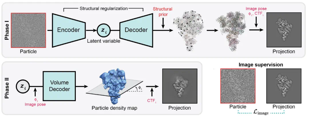 第二阶段通过训练一个密度图解码器来得到密度图模态的动态构象解析结果。在 VAE 训练完成后,提取所有图像对应的潜在变量并用于训练密度图解码器。密度图的细节优化由输入图像约束,不受结构先验和正则化的直接影响,从而最小化结构先验对输出密度图的 bias,使得生成的密度图可用于评估和验证粗粒度原子结构模型。