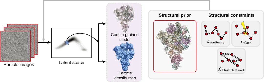 CryoSTAR 是首个成功在冷冻电镜实验数据上应用蛋白质原子结构模态先验的方法,方法的主要特点有: