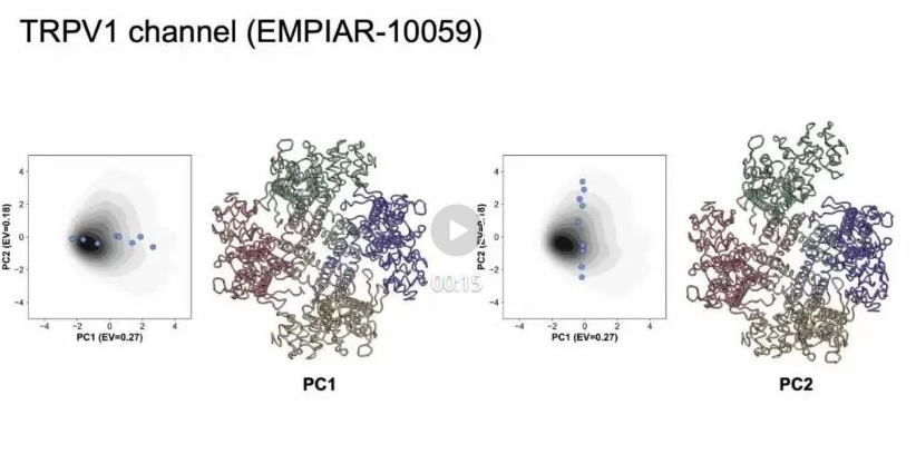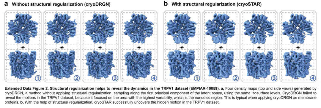 对于 TRPV1 通道蛋白(EMPIAR-10059),使用 PDB: 7RQW 作为参考先验原子模型,cryoSTAR 发现了蛋白外周可溶结构域的微妙而平滑的运动,每个亚基的运动可通过不同主成分可视化。研究还表明结构正则化在揭示膜蛋白动力学方面具有关键作用,相比之下,没有结构先验的方法如 cryoDRGN 在膜蛋白的动态解析方面存在不足。