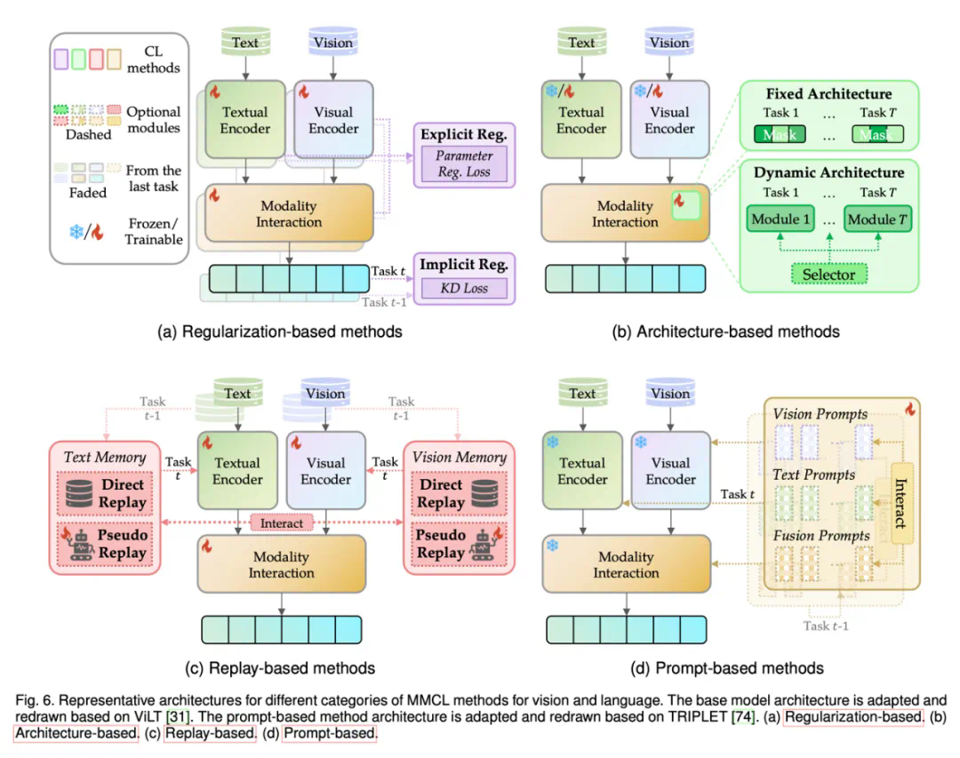 挑战 4 预训练零样本能力的退化:随着预训练模型的进步,MMCL 方法可以用这些强大的模型。这些预先训练好的多模态模型经常会表现出零样本能力。然而,在训练过程中,该能力可能会减弱。这种退化风险可能导致未来任务上的严重性能下降,这被称为 MMCL 中的负前向知识转移。