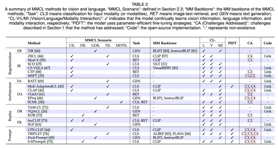 参数高效微调的 MMCL 方法:参数高效微调(PEFT)方法提供了一种有效的解决方案,以优化训练成本。虽然基于提示的方法是参数高效的,但在表 2 中可以看到,其他类别中仅有 MoE-Adapters4CL 利用了 PEFT 方法。因此,考虑到近年来涌现出众多 PEFT 方法,将它们应用于减少 MMCL 方法的训练成本是一个值得探索的方向。此外,除了简单地应用现有 PEFT 方法,一个有前景的方向是为 MMCL 设置提出新的 PEFT 方法,并将其与其他 MMCL 技术良好集成。 -
