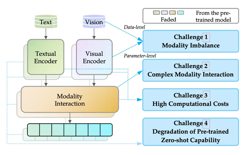 挑战 1 模态失衡:模态失衡是指多模态系统中不同模态的处理或表示不均衡,表现在数据和参数两个层面。在数据层面,不同模态的数据可用性可能会在 CL 过程中发生显著变化,出现极度不平衡的情况,如缺乏某些模态。在参数层面,不同模态组件的学习可能会以不同的速度收敛,从而导致所有模态的学习过程整体失衡。 -