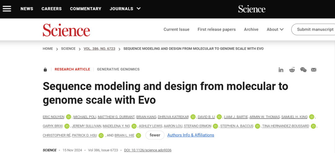 该研究以「Sequence modeling and design from molecular to genome scale with Evo」为题,于 2024 年 11 月 15 发布在《Science》。