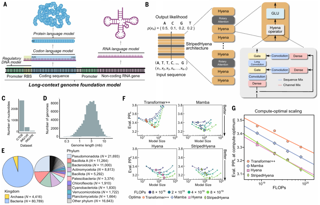 基因组基础模型 Evo 是一个基于 StripedHyena 的基础模型,该模型在 270 万个进化多样的原核生物和噬菌体基因组上进行了预训练,从而获得对 DNA 语言的基本理解,可以预测 DNA 的功能或生成新的 DNA 序列。StripedHyena 架构混合了密集二次 Transformer 算子和次二次型 Hyena 算子。