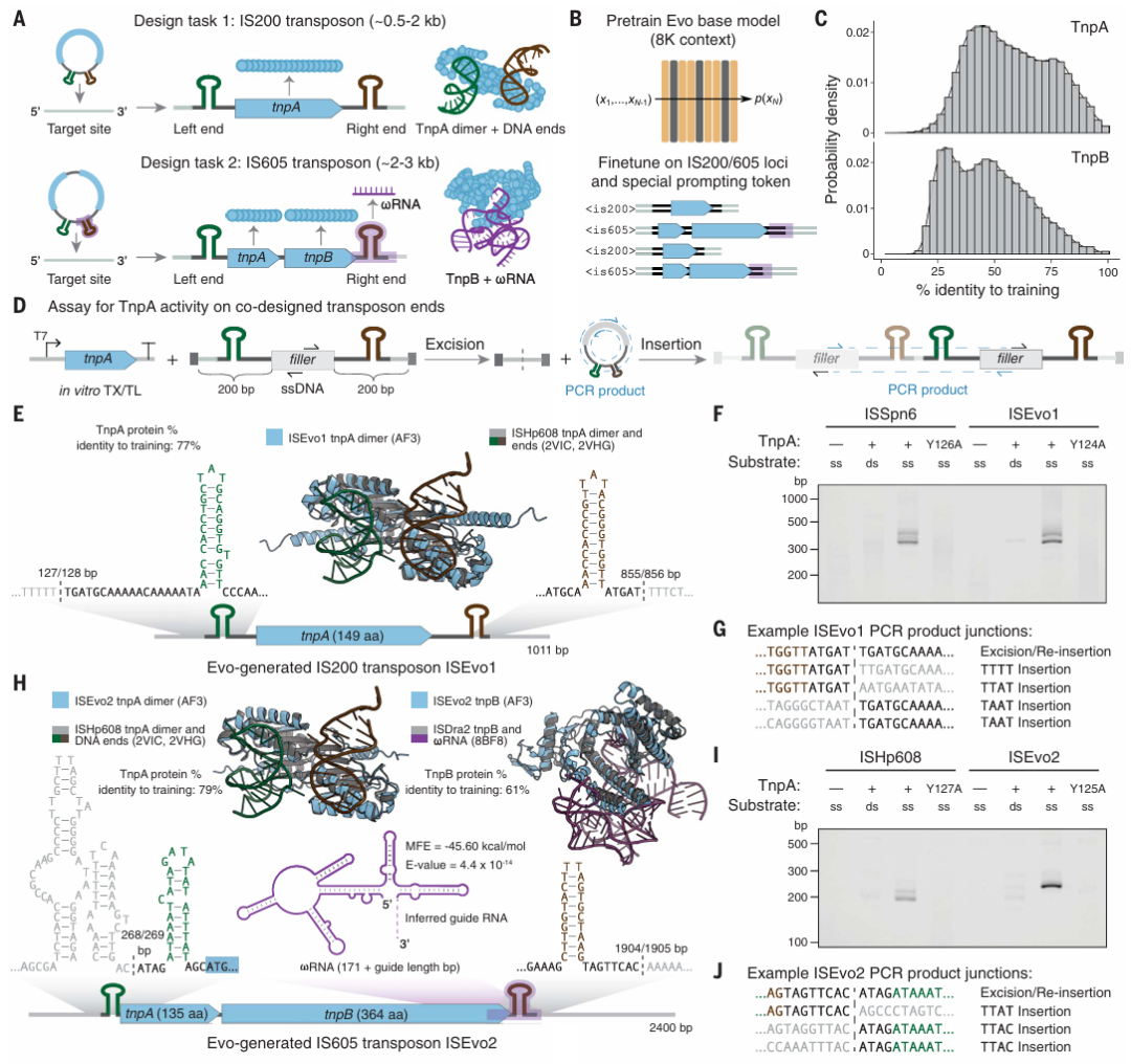 Evo 还擅长多模态生成任务,团队通过生成合成的 CRISPR-Cas 分子复合物和转座系统证明了这一点。研究人员实验验证了 Evo 生成的 CRISPR-Cas 分子复合物以及 IS200 和 IS605 转座系统的功能活性,这是使用语言模型进行蛋白质-RNA 和蛋白质-DNA 协同设计的第一个实例。