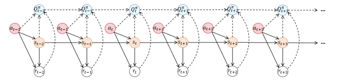 图 1. 决策过程的概率图模型。实线连接的节点表示数据集中的数据,而虚线连接的 Q 值(即动作值、累积回报)不属于数据集。