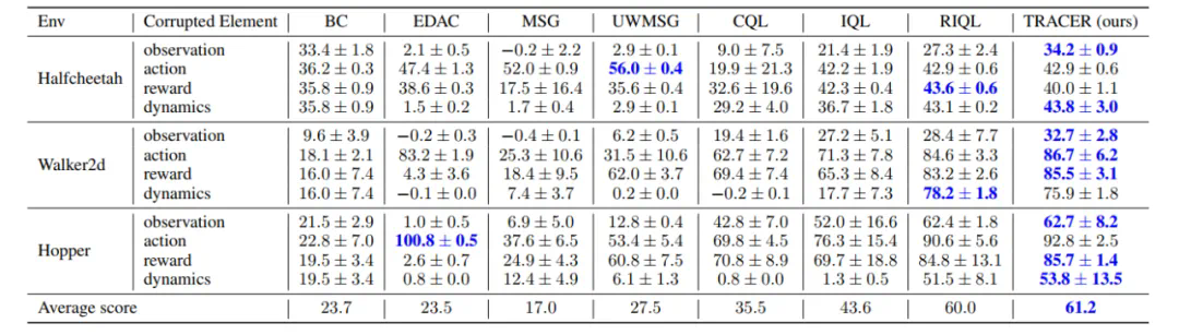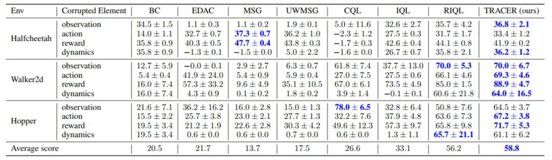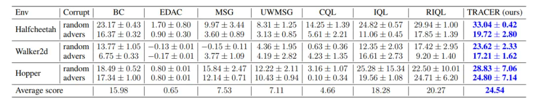 表 1. 离线数据集的所有类型元素均存在随机损坏(random)或对抗损坏(advers)时,我们的方法 TRACER 在所有环境中都获得了最高的平均得分。