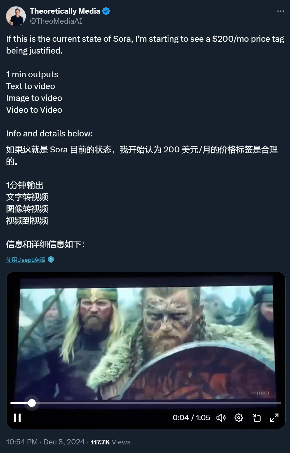 Sora 真的要来了?最近几天,OpenAI 开启了为期 12 天的连续发布,第一天发布的 o1 完全体和 200 美元一个月的 ChatGPT Pro 刷新了外界对 AI 大模型定价的认知;第二天发布的强化微调(Reinforcement Fine-Tuning)则吸引了大批研究者和开发者的兴趣。那第三天发什么呢?种种信号表明:很有可能是新版本的 Sora。这种猜测源自 OpenAI 创意专家 Chad Nelson 在伦敦 C21Media 活动中的一次分享。在分享中,Chad Nelson 现场播放了多段由 Sora 生成的视频,并着重介绍了视频中的一些细节,比如在一个战争场面中,一个女战士的脸上、皮肤上甚至牙齿上都布满了泥浆和鲜血,而且这些印迹是有 3D 深度的(说明已经凝固),这说明 Sora 对于它所生成的场景是有一定了解的。根据泄露的现场视频,网友还整理出了更多关于新版本 Sora 能力的信息: 而且,从画面效果来看,Sora 生成的视频无论是分辨率还是帧率似乎都很高,主体一致性也令人印象深刻。如果 ChatGPT Pro 那 200 美元的订阅费用里包含 Sora,可能这个费用看起来就没有那么离谱了。除了这个泄露视频,OpenAI 官方 Youtube 账号也在周末放出了新的 Sora 作品,这或许也是给 Sora 的新发布做预热。在刚刚上传的视频中,我们可以看到一群狂欢的年轻人在跳舞。该视频由东京跨学科艺术家 Emi Kusano 借助 Sora 完成。根据介绍,这个项目是受到了 1980 年代一个时尚团体 Takenoko-zoku 启发创作出来的。根据视频内容,我们不难发现 Sora 精准地捕捉到了一群年轻人狂欢的场景,特别是舞蹈场景,展现了 Sora 独有的、可以创造出一种人类难以复制的独特魅力。尤其是多人物同屏,以及画面的表现力运镜非常高级,同时它还保持了电影般的质感,人群中的每个个体细节表现非常出色。Emi Kusano 表示,创作过程中最让她兴奋的是 Sora 能够将自己脑海中想象的图像通过提示转化为视频,她将这种感觉形容为像是掉进了兔子洞(兔子洞源于著名童话书《爱丽丝漫游奇境记》,在这本书中,主角爱丽丝从兔子洞掉入了一个拟人化的异境世界,开启了她奇妙的旅程)。看到最新版 Sora 视频,大家都用难以置信来形容,同时也希望如果 Sora 单独收费,价格不要太离谱。毕竟 ChatGPT Pro 已经高达 200 美元一个月了。接下来,大家可以期待一下 OpenAI 即将要发布的内容,你认为新版 Sora 会来吗?参考链接:https://www.youtube.com/watch?v=c_kKKRQ5gYwhttps://x.com/JustinLin610/status/1865798885643620400