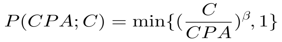 ,在超成本即实际 CPA > C 时,P (CPA; C) < 1,会对转化进行降权。
