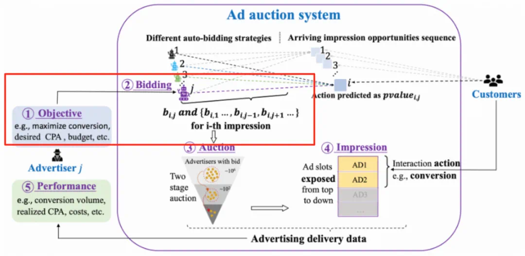 简单来说,在比赛中,参赛者扮演自动出价 Agent(即广告主),在大规模拍卖环境下与其他 47 个竞争对手对抗,作出有效的出价决策,并在满足投放需求的情况下帮助广告主最大化投放效果。