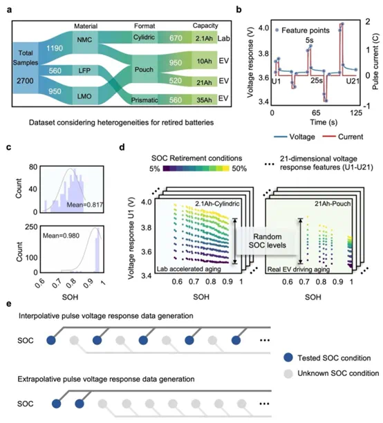 团队构建了2700个退役锂离子电池脉冲注入样本的物理测试数据集,涵盖了3种正极材料类型、3种物理形式、4种容量设计和4种历史使用场景,如图2所示。这些物理测试数据被用于验证所提方法在脉冲数据生成中的有效性。