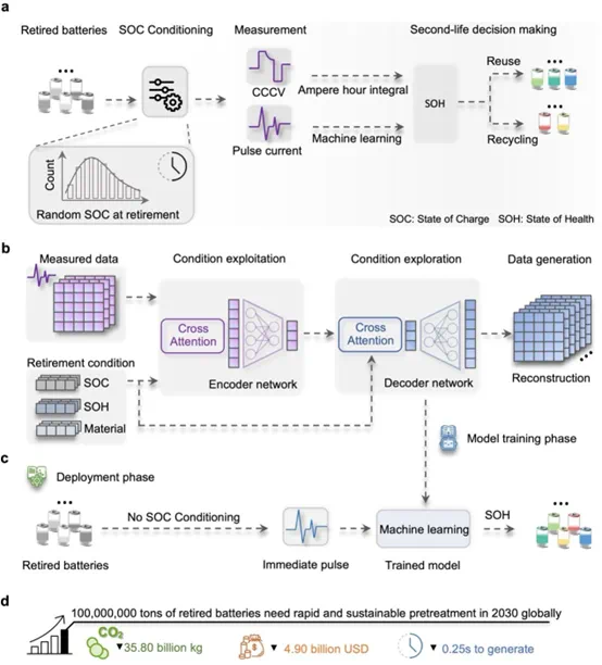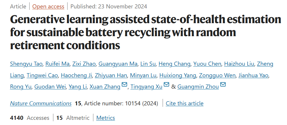 相关的研究成果以「Generative learning assisted state-of-health estimation for sustainable battery recycling with random retirement conditions」为题,发表在《Nature Communications》上。