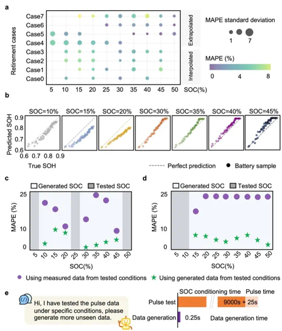 团队通过生成式机器学习方法,在少量已测量数据的基础上,实现了未测量数据空间的精准探索。模型利用已有的脉冲电压响应数据进行训练,可生成不同SOC条件下的新脉冲电压响应数据,如图3所示。实验表明,无论在内插还是外推场景中,生成数据的平均绝对百分比误差(MAPE)均低于2%,充分证明了模型对已测量数据分布的有效学习能力及其生成多样化数据样本的潜力。