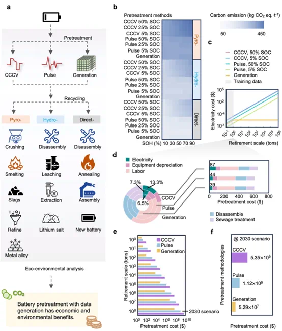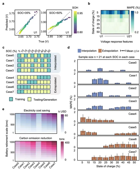 与传统的CCCV测试相比,基于生成模型的脉冲测试方法无需耗费大量时间调整SOC,也避免了对退役电池的额外损害。技术经济评估显示,在2030年全球动力电池退役场景下,该生成式机器学习辅助的SOH估计方法可节省约49亿美元电力成本,减少358亿公斤二氧化碳排放(如图5所示)。这一方法在时间效率、能耗降低、环境效益和操作灵活性方面展现了显著优势。