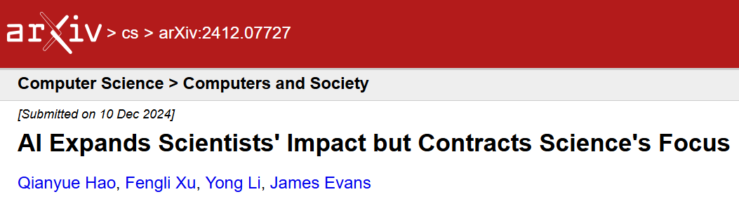 该研究以「AI Expands Scientists’ Impact but Contracts Science’s Focus」为题,于 2024 年 12 月 10 日发布在 arXiv 预印平台。