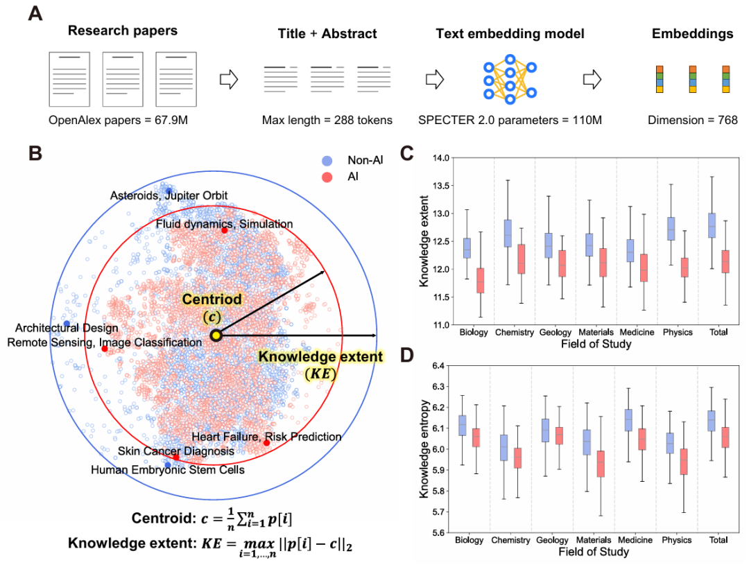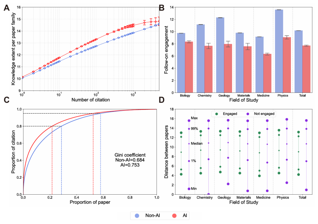 芝加哥大学和清华大学的研究人员分析了六个科学学科(生物学、医学、化学、物理学、材料学和地质学,不包括计算机科学)的近 6800 万份研究论文,发现融入人工智能技术的论文被引用的次数更多,但同时也集中在更窄的主题上,而且重复性更强。