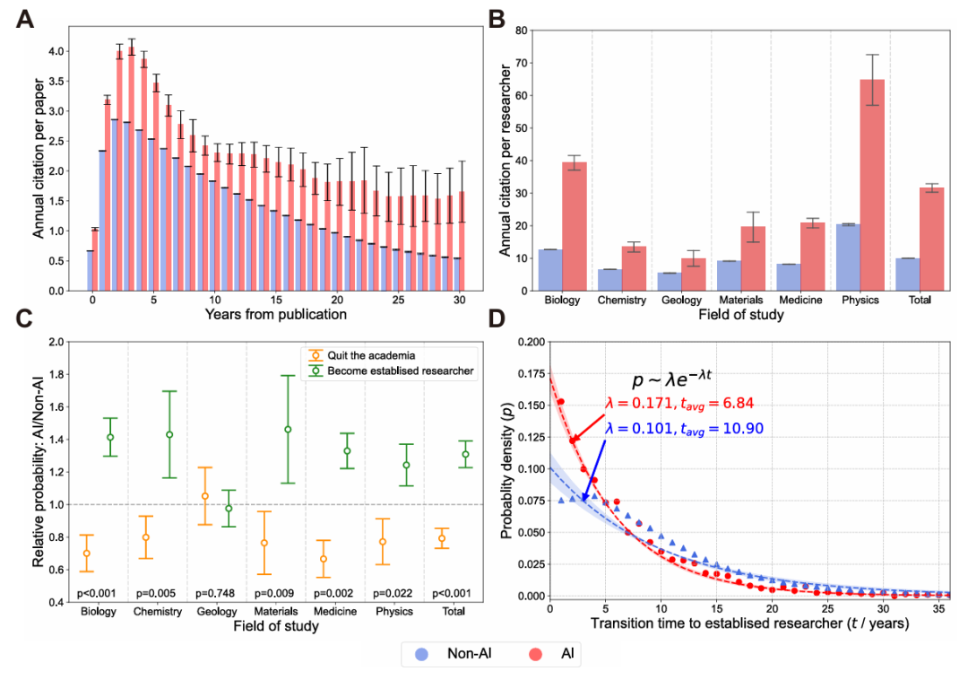 他们发现,与非人工智能同行相比,使用人工智能的初级科学家继续领导研究团队的可能性高出 32%,而且他们进入职业生涯这一阶段的速度要快得多,而非人工智能同行更有可能完全离开学术界。