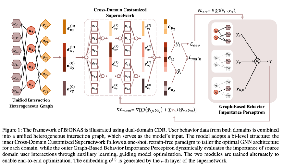 本文提出了一种新的跨域推荐系统框架,称为行为重要性感知图神经网络架构搜索(BiGNAS)。现有的基于图神经网络(GNN)的 CNR 方法虽然能够捕捉复杂的用户 – 物品交互,但通常依赖于手动设计的架构,BiGNAS 旨在解决推荐系统中的数据稀疏性和冷启动问题。BiGNAS 通过两个关键组件实现了创新:跨域定制超网络(Cross-Domain Customized Supernetwork)和基于图的行为重要性感知器(Graph-Based Behavior Importance Perceptron)。超网络作为一次性、无需重训练的模块,能够自动搜索每个域的最佳图神经网络(GNN)架构,减少了手动设计的复杂性。行为重要性感知器则通过辅助学习动态评估源域行为的重要性,从而提升目标域的推荐效果。