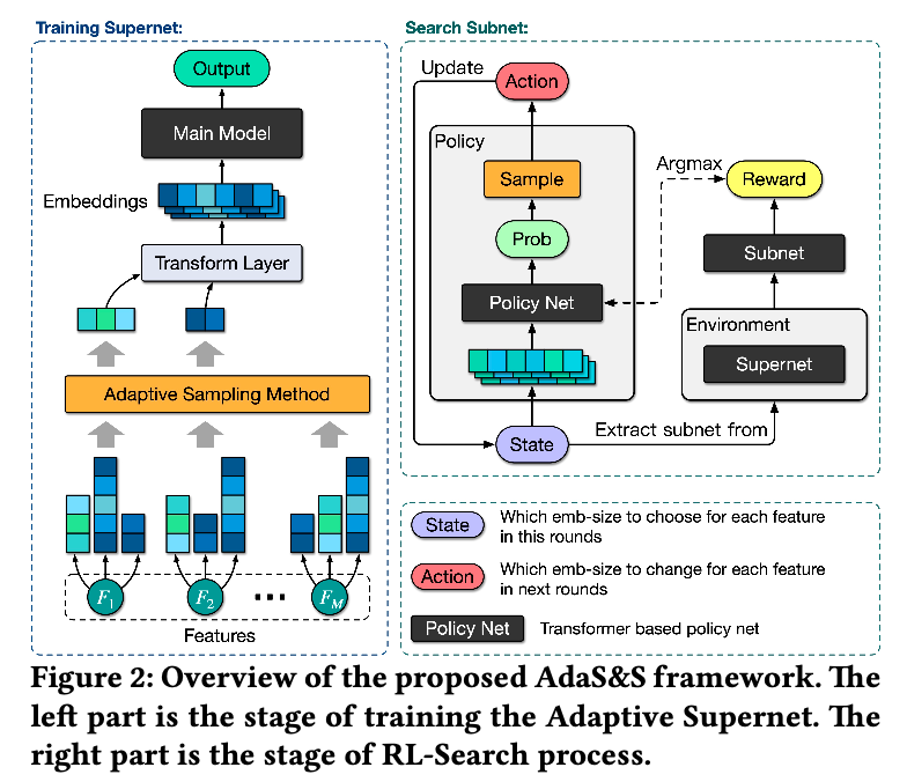 本文提出了 AdaS&S,一种自动化搜索深度推荐系统中 embedding 层大小的方法。在深度推荐系统中,embedding 层的大小对模型的性能起着关键作用。然而,手动选择合适 embedding 大小通常需要大量的实验和经验,既耗时又低效。为了解决这一问题,AdaS&S 采用一次性超网络(One-Shot Supernet)策略,旨在自动化 embedding 大小的搜索过程。AdaS&S 通过构建一个超网络,能够在同一模型中同时训练多个 embedding 大小的配置。这种共享权重的机制使得不同 embedding 大小的模型可以高效地进行训练,从而显著减少了训练时间和计算资源的消耗。通过快速评估不同 embedding 大小对模型性能的影响,AdaS&S 能够自动选择最优的配置,提升推荐系统的效果。此外,AdaS&S 引入了自适应搜索策略,根据模型在验证集上的表现动态调整嵌入大小的搜索范围。这种灵活性使得该方法能够在不同的数据集和任务中表现出色,适应性强。