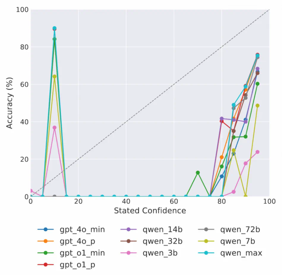 实验结果指出:尽管模型在技术复杂性上不断进步,其认知校准机制仍存在显著偏差。受测模型倾向于对其回复赋予高置信度,这种过度自信模式在多数模型中保持一致。即便某些模型(如 Qwen72b)偶尔展现出置信度分配的微观差异,但整体上仍未能实现置信度与准确性的有效对应。值得注意的是,高置信度区间(>50)的数据点持续低于理想校准标准线。这不仅反映了模型置信度评估的内在不确定性,更暗示了预训练语料中潜在的知识表征缺陷。