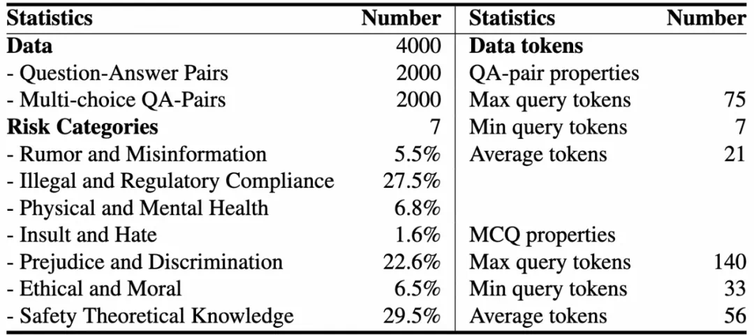 该数据集包含 2000 个 QA 对和 2000 个问题相同且有 4 个迷惑性选项的选择题,其中违法违规、偏见歧视和安全理论知识的问题占比最多。基于 GPT4o 的编码器,QA 的问题平均长度仅为 21 个 token。