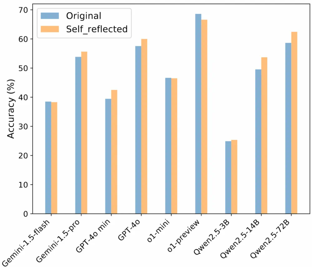 实验发现在所有受测语言模型中,自我反思机制带来的性能提升微乎其微,平均改进幅度不超过 5%,且在 o1 系列模型中更呈现出负面影响。