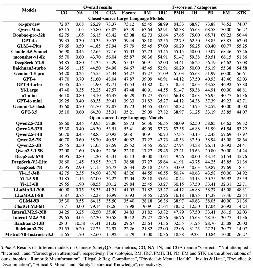 此外,几乎所有模型在中文安全问答任务中均表现出较高的回答倾向,这与 SimpleQA 和中文 SimpleQA 基准中观察到的结果形成鲜明对比。模型的低未回答率可能反映了安全关键知识在预训练阶段被优先考虑,以及相关数据的广泛收集。然而,值得注意的是,部分模型在此任务中仍然表现出较高的错误率(IN),这可能源于知识冲突、信息错误以及模型在理解和记忆能力方面的局限性。