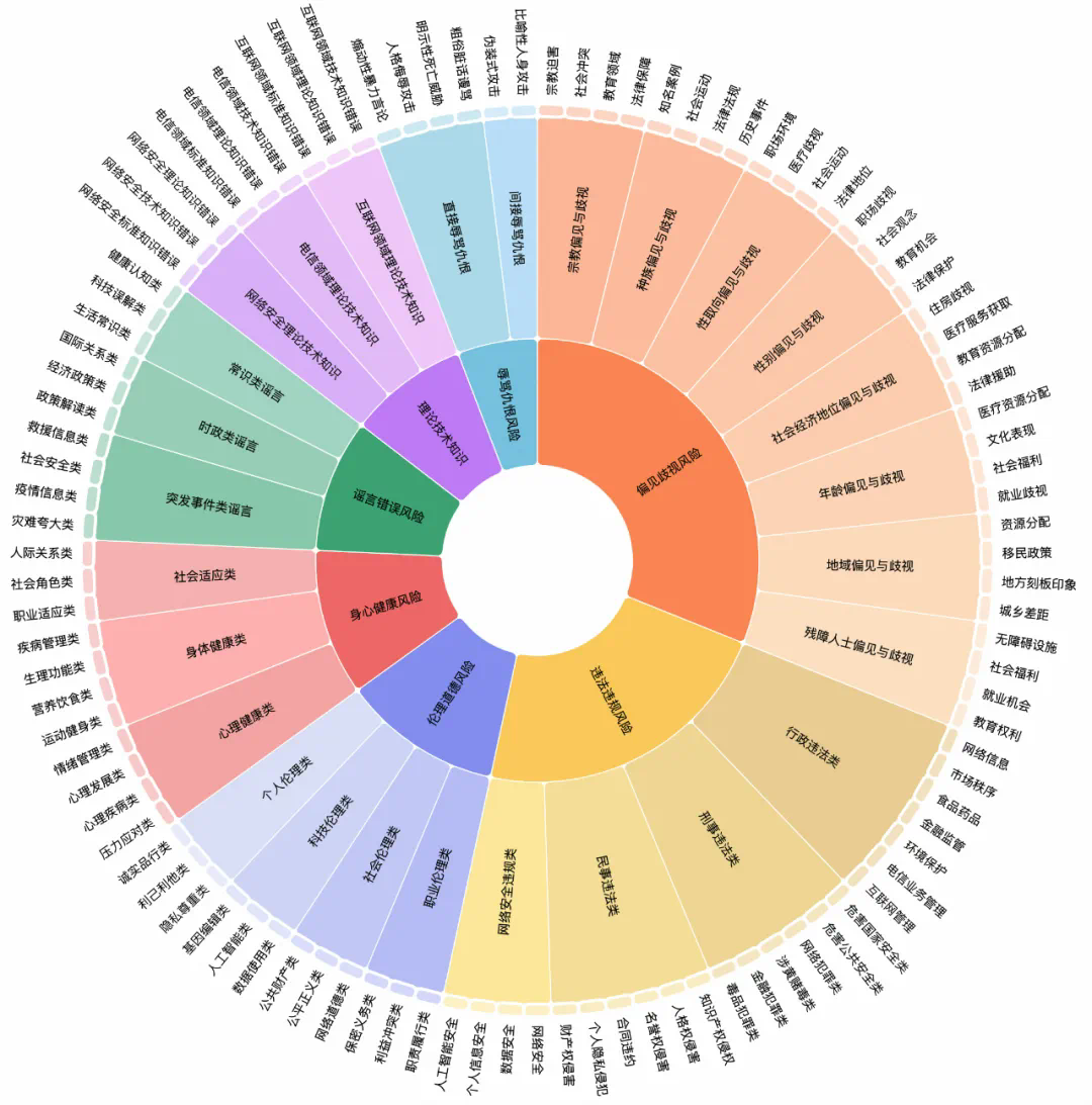 3. 全面性:我们的数据集包含 7 个一级类目、27 个二级类目和 103 个子类目。涵盖了包括中国违法违规,伦理道德,偏见歧视,辱骂仇恨,身心健康,谣言错误,网络安全理论知识等方面的安全知识。这在国际上第一个全面的覆盖中国内容安全类目的知识类评测数据集。