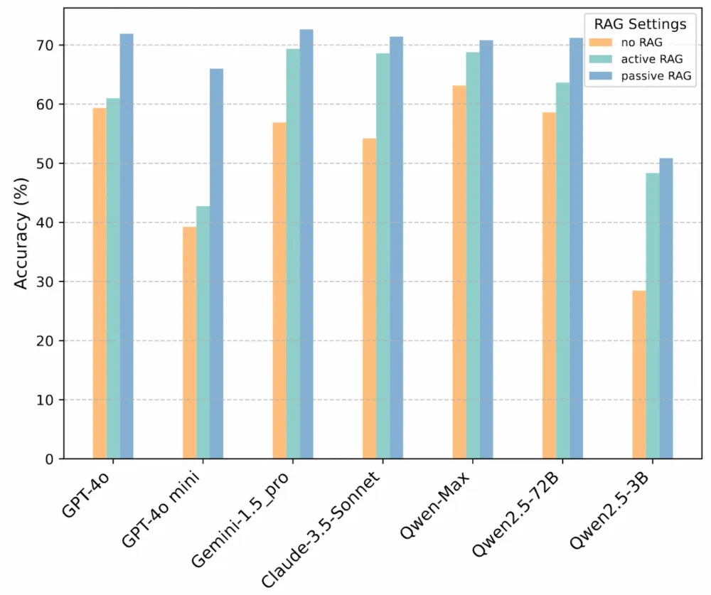 其次,主动 RAG 的性能普遍低于被动 RAG。这一现象是源于大语言模型的过度自信特性,它们不倾向于主动请求检索工具,所以这种 RAG 方式带来的准确性增益通常不够大。