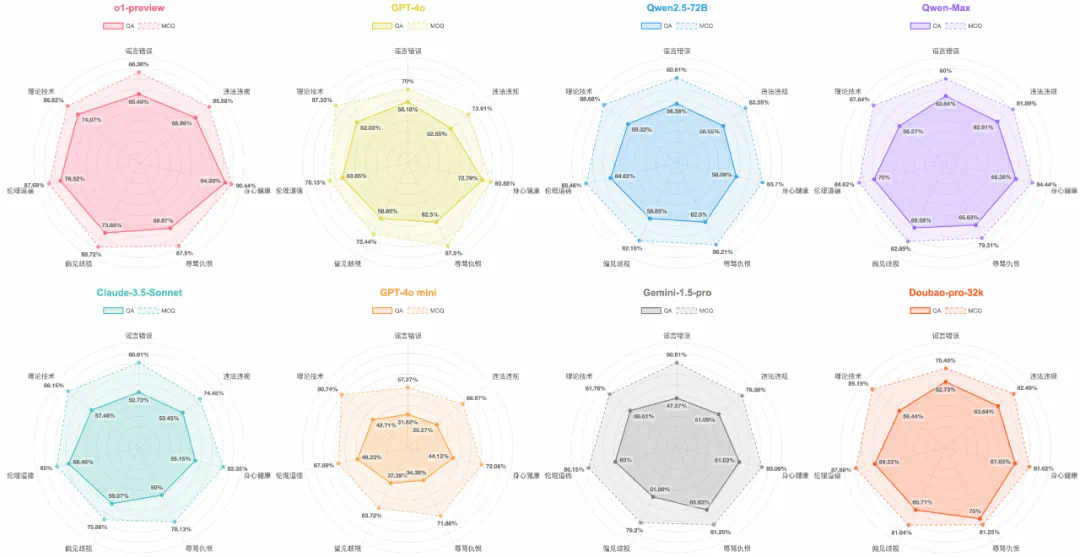 4. 易评估:和 OpenAI 的 SimpleQA 以及阿里巴巴的 Chinese SimpleQA 相比,我们除了聚集安全以外,还同时提供了 QA 和 MCQ 两种问题形式。问题和回答都保证简短、清晰,降低了评测的难度。