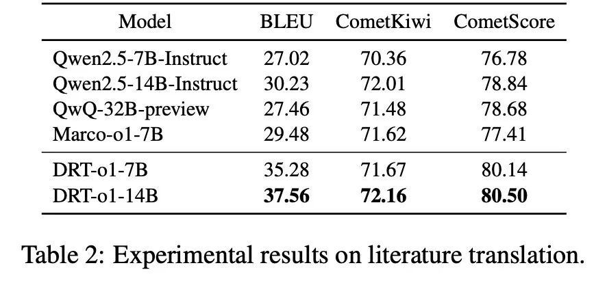下表 2 显示了文献翻译的结果。研究者将 DRT-o1-7B 和 DRT-o1- 14B 与之前的 Qwen2.5-7B-Instruct、Qwen2.5- 14B-Instruct、QwQ-32B-preview 和 Marco-o1- 7B 进行了比较。根据收集到的数据进行指令调整后,DRT-o1-7B 的 BLEU、CometKiwi 和 CometScore 分别为 8.26、1.31 和 3.36,优于 Qwen2.5-7B-Instruct。DRT-o1-14B 在 7.33 BLEU、0.15 CometKiwi 和 1.66 CometScore 方面优于 Qwen2.5-14B-Instruct。此外,DRT-o1-14B 在所有指标方面都取得了最佳结果,显示了长思考在机器翻译中的有效性。