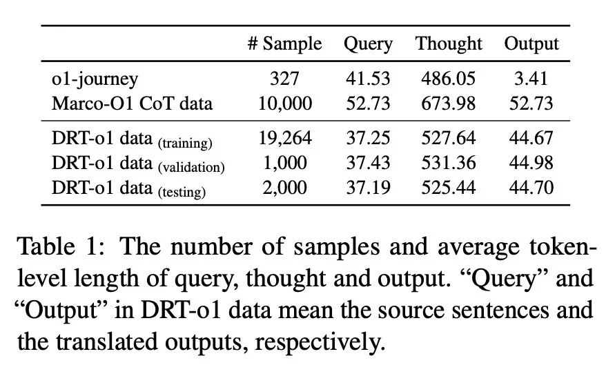 研究者将收集到的 22264 个样本分为训练集、验证集和测试集,样本数分别为 19264、1000 和 2000。表 1 列出了 DRT-o1 数据和以往类似 O1 数据的数据统计。对于 Marco-O1 CoT 数据,由于其尚未完全发布,此处使用其演示数据来计算数据统计。可以看到,合成的思考中的平均 token 数达到了 500 多个,这与之前面向数学的 O1 类 CoT 数据相似。