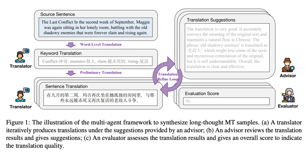 为了合成长思考机器翻译样本,本文提出了一个多智能体框架,其中包括翻译者、顾问和评估者。这三个智能体以迭代方式协作,在机器翻译过程中产生长思考。最后,使用 GPT4o 进一步提高合成长思考机器翻译样本的质量; -