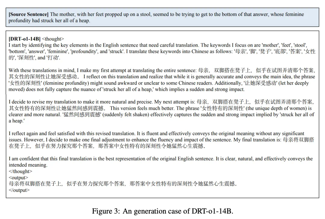 图 3 显示了 DRT-o1-14B 的一个示例。可以看到,该模型学习了收集的数据的思维过程。DRT-o1-14B 首先执行词级翻译,然后尝试初步翻译。接下来,它会不断改进翻译,直到它认为翻译足够好为止。