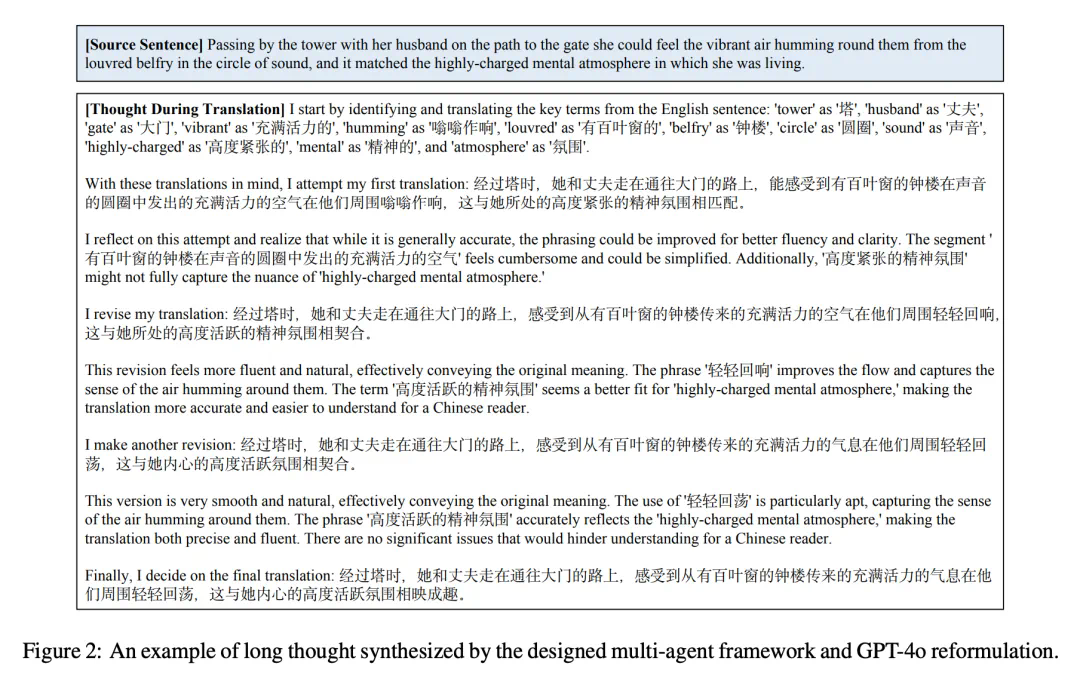 (2)通过设计的多智能体框架对收集到的句子进行长时间思考翻译过程的合成(§ 2.2);