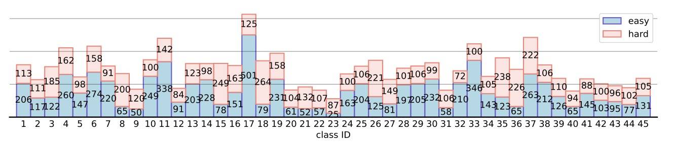 图 3:各种动物类别的数据布局。水平轴表示类别 ID,垂直轴表示简单和困难组的照片数量。