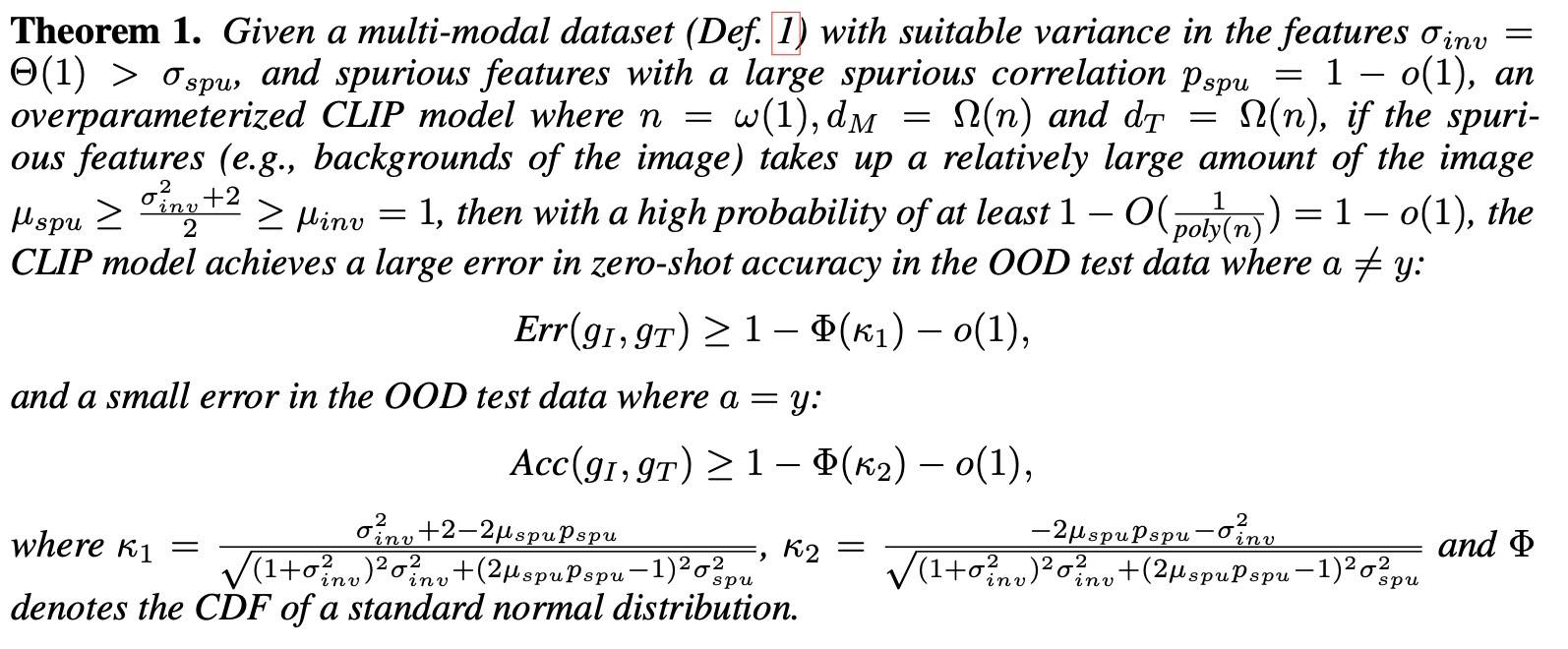 该定理表明,当 CLIP 模型在假特征与输出标签强相关的数据上训练时,只要这些相关性存在,它就能达到高准确率。然而,在这些相关性不存在的分布外设置中,模型的准确率会显著下降。这和我们在 CounterAnimal 上的真实实验观察是一致的。