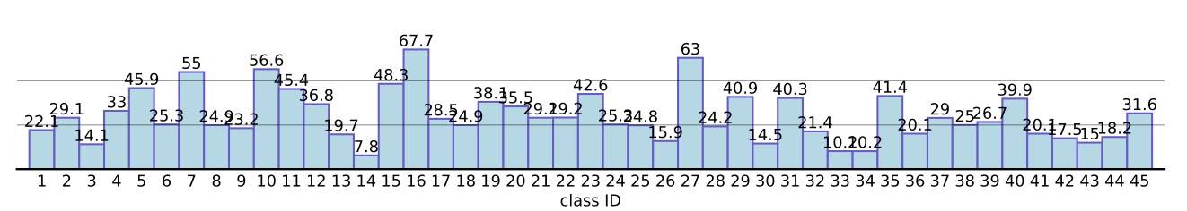 图5:使用 CLIP-LAION400M-ViT-B/32 的性能下降(%)。水平轴表示类别 ID,垂直轴表示下降的百分点。