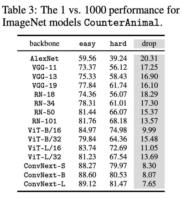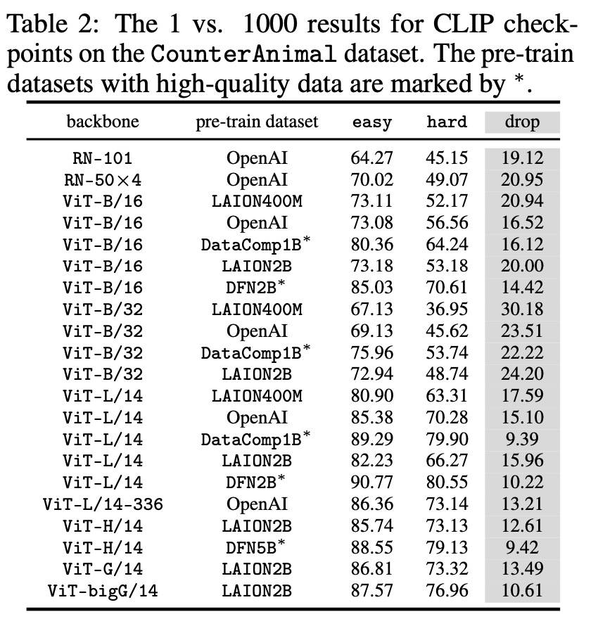 –普遍的假相关性:CLIP 模型在从“简单”组过渡到“困难”组时表现出显著的性能下降,表明 CounterAnimal 数据集确实包含了各种 CLIP 模型配置中普遍存在的假相关性。