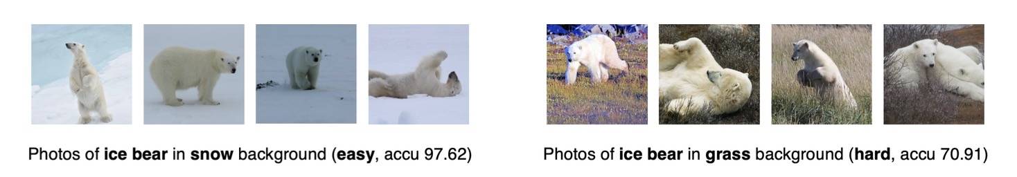 我们使用了来自 iNaturalist 的图像,并根据背景对其进行分类。例如,北极熊的图片通常呈现雪地背景。然而,我们的数据集额外包含一组反例,例如北极熊出现在草地环境的图片,这对 CLIP 模型学习到的关联性构成了一定的挑战。