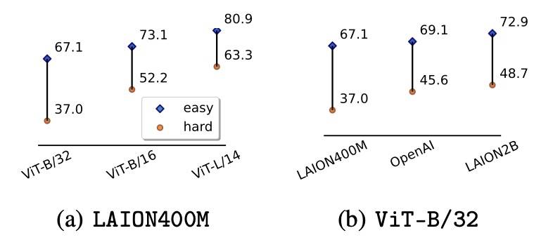 此可视化展示了模型对背景信息的依赖。在背景与训练数据匹配的场景中(“简单”),模型表现良好。然而,当引入非典型背景时(“困难”),准确率会显著受到影响,展示了 CLIP 模型分布外泛化能力的差距。这一现象表明了 CLIP 模型对环境信息的依赖,很大程度上限制了这些模型在真实世界应用中的有效性。